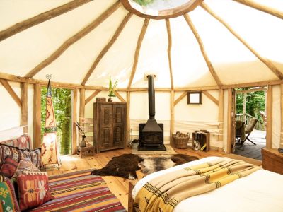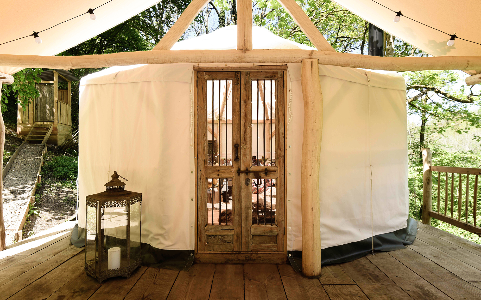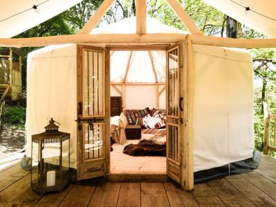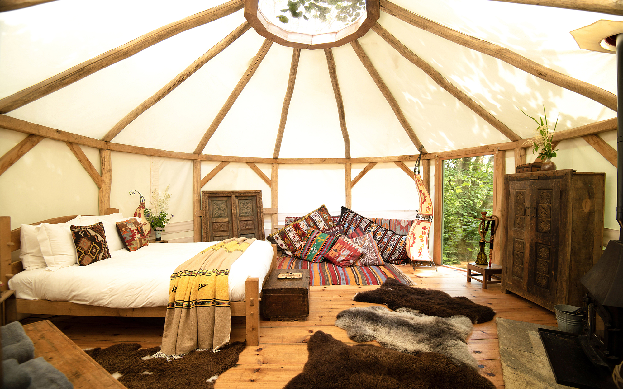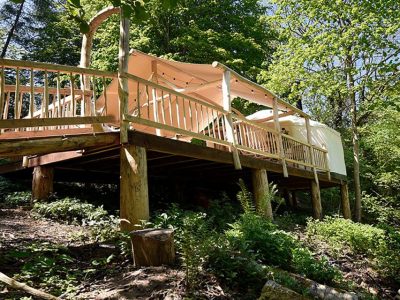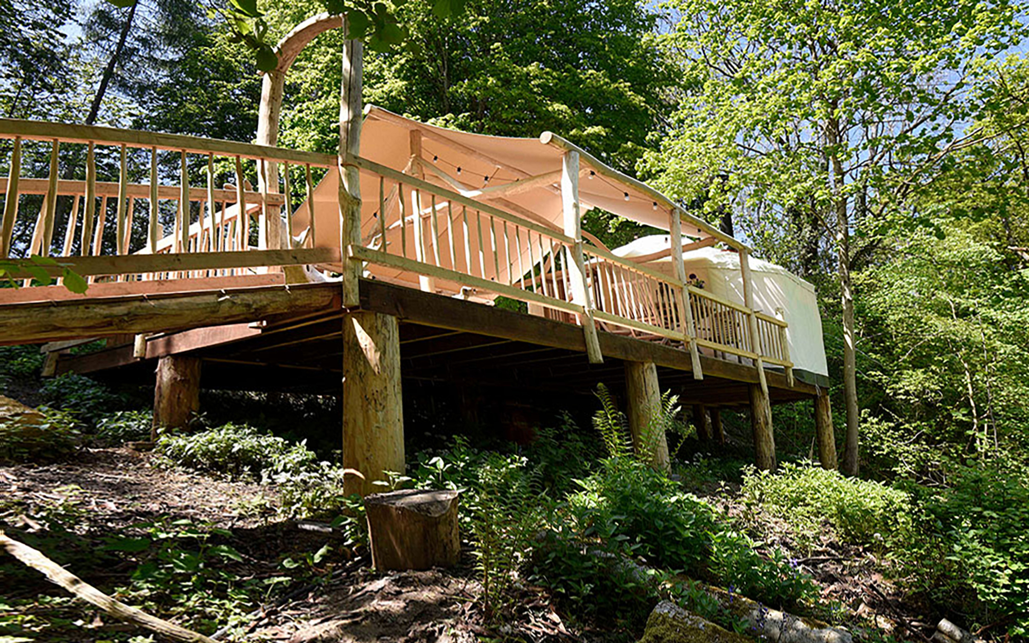 Perched on a platform jutting out into the trees at the end of the woods, the Far Out Yurt is a world of its own, far from the crowds, secluded and serene.