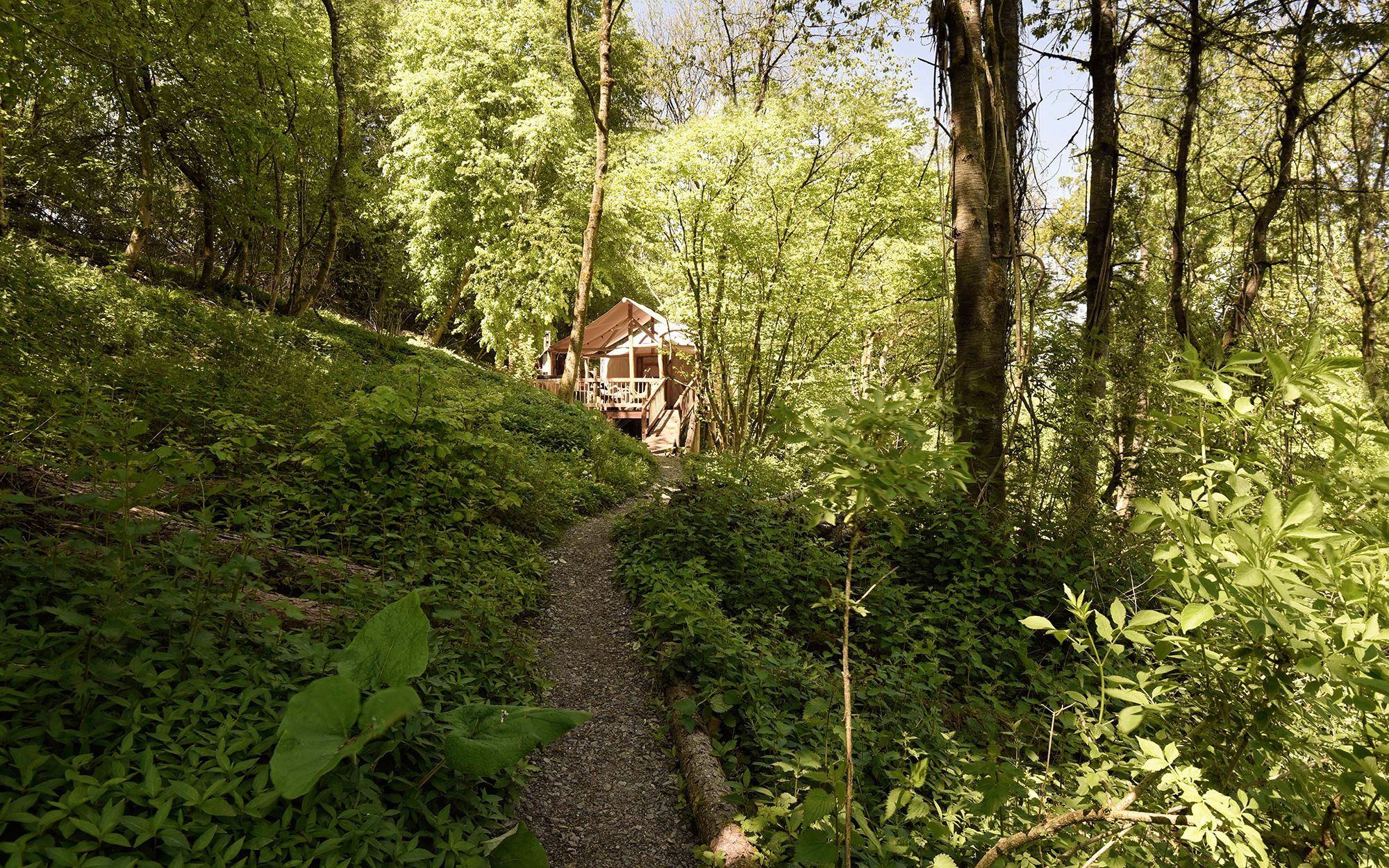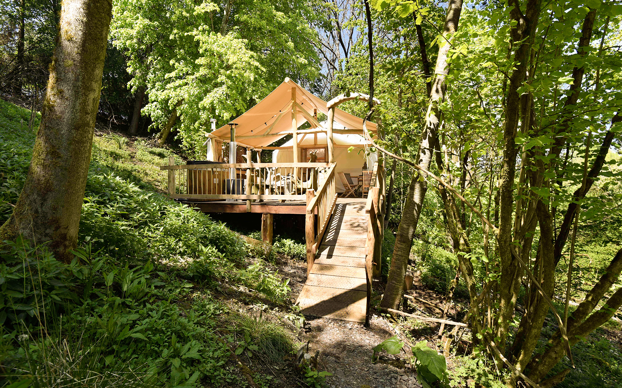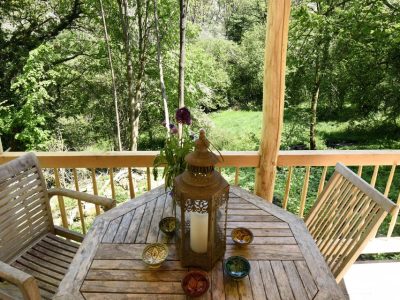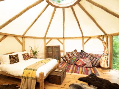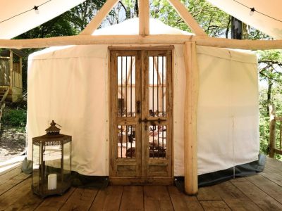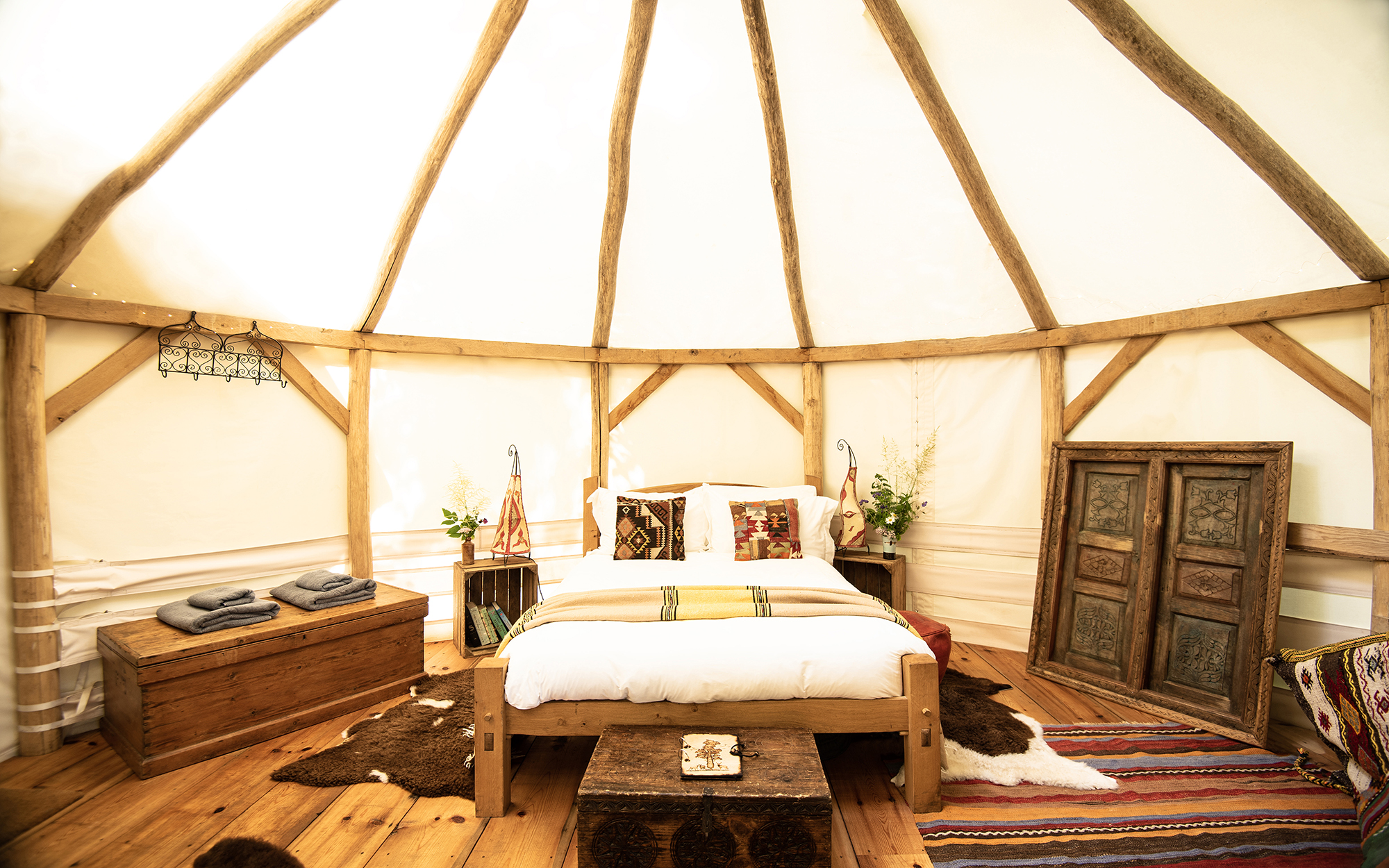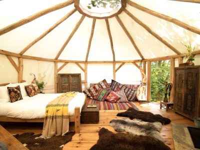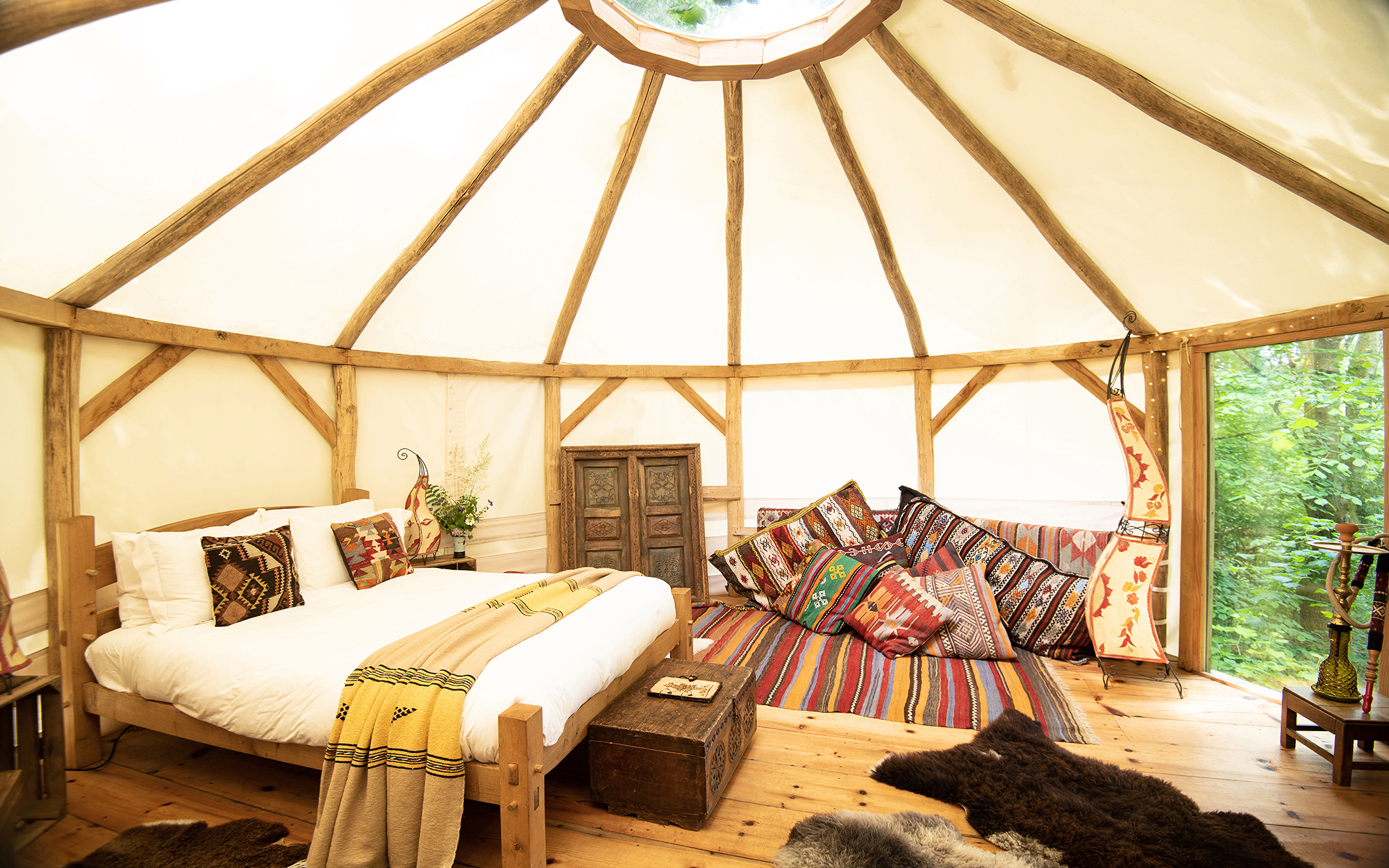 Perched on a platform jutting out into the trees at the end of the woods, the Far Out Yurt is a world of its own, far from the crowds, secluded and serene.