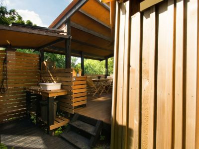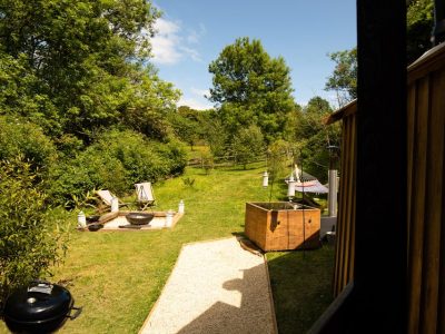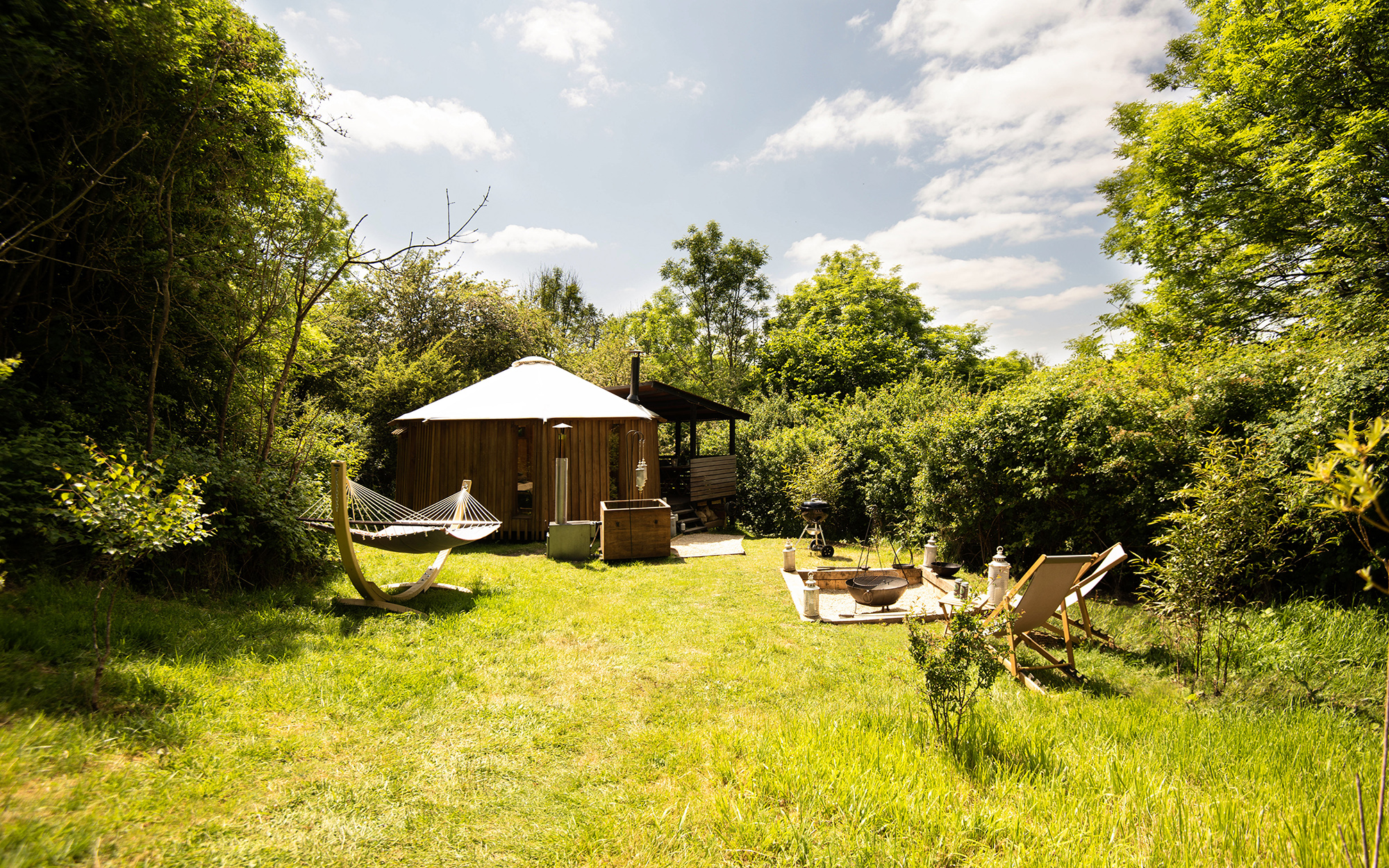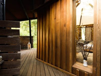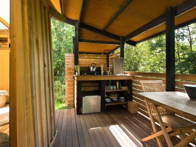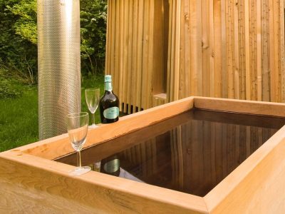 The ensuite toilet and hot shower are on the enclosed deck just outside the door, where you will also find the fully-equipped camp kitchen. Next to the cabin, set in the woodland glade, is the Ofuro soaking tub, an exquisite piece of traditional Japanese design given a contemporary tweak by some serious dudes in California. Unlike more conventional hot tubs, the Ofuro is square, crafted in teak and heated by its own wood-burning stove.