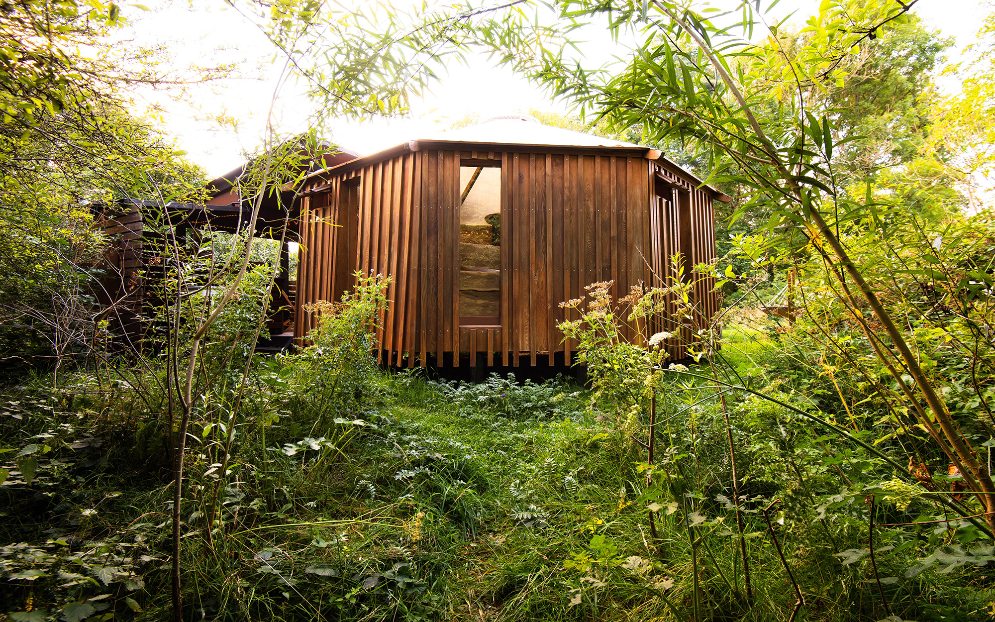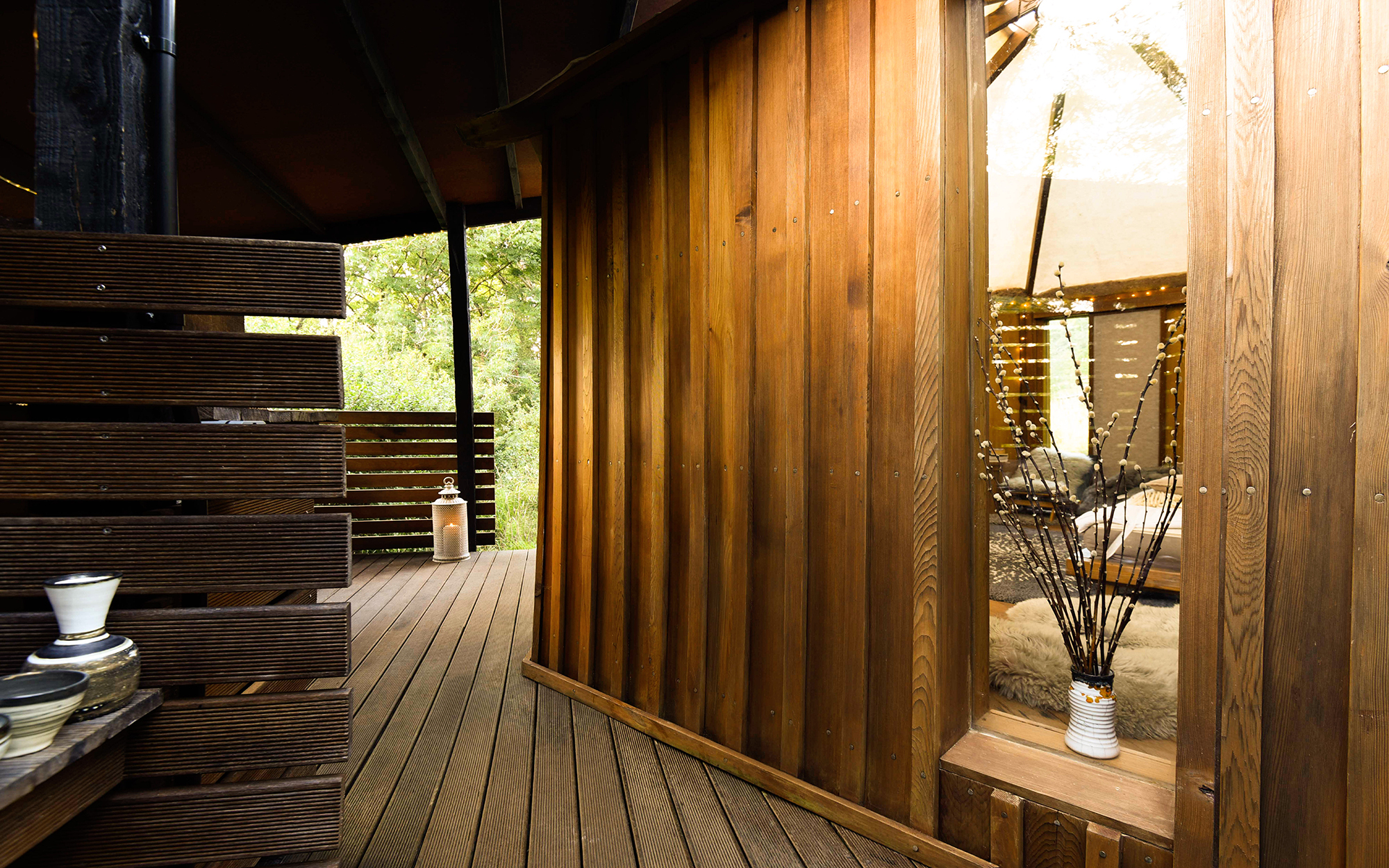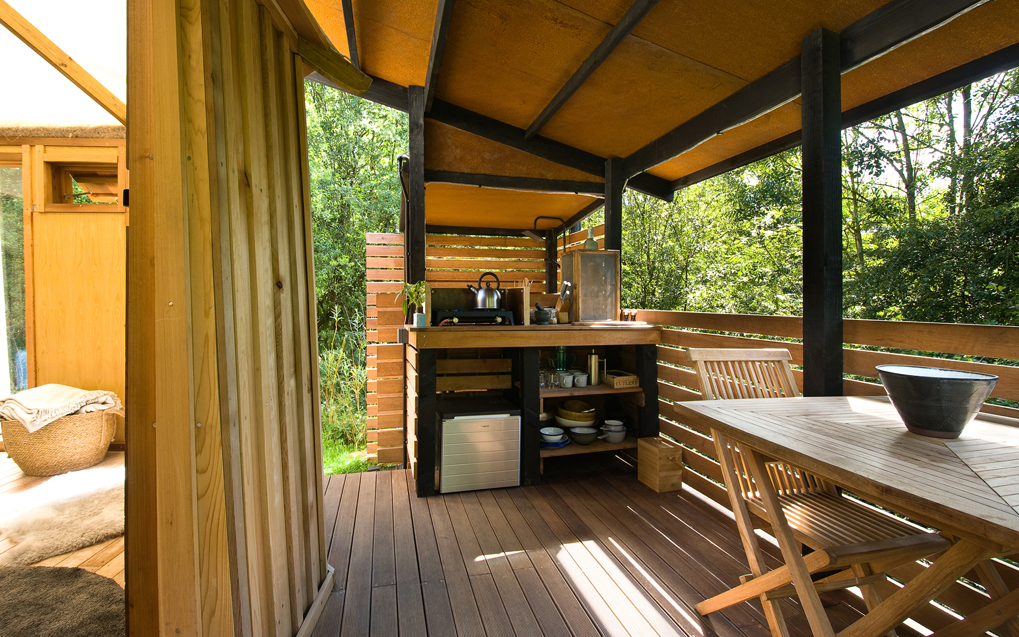 The ensuite toilet and hot shower are on the enclosed deck just outside the door, where you will also find the fully-equipped camp kitchen. Next to the cabin, set in the woodland glade, is the Ofuro soaking tub, an exquisite piece of traditional Japanese design given a contemporary tweak by some serious dudes in California. Unlike more conventional hot tubs, the Ofuro is square, crafted in teak and heated by its own wood-burning stove.