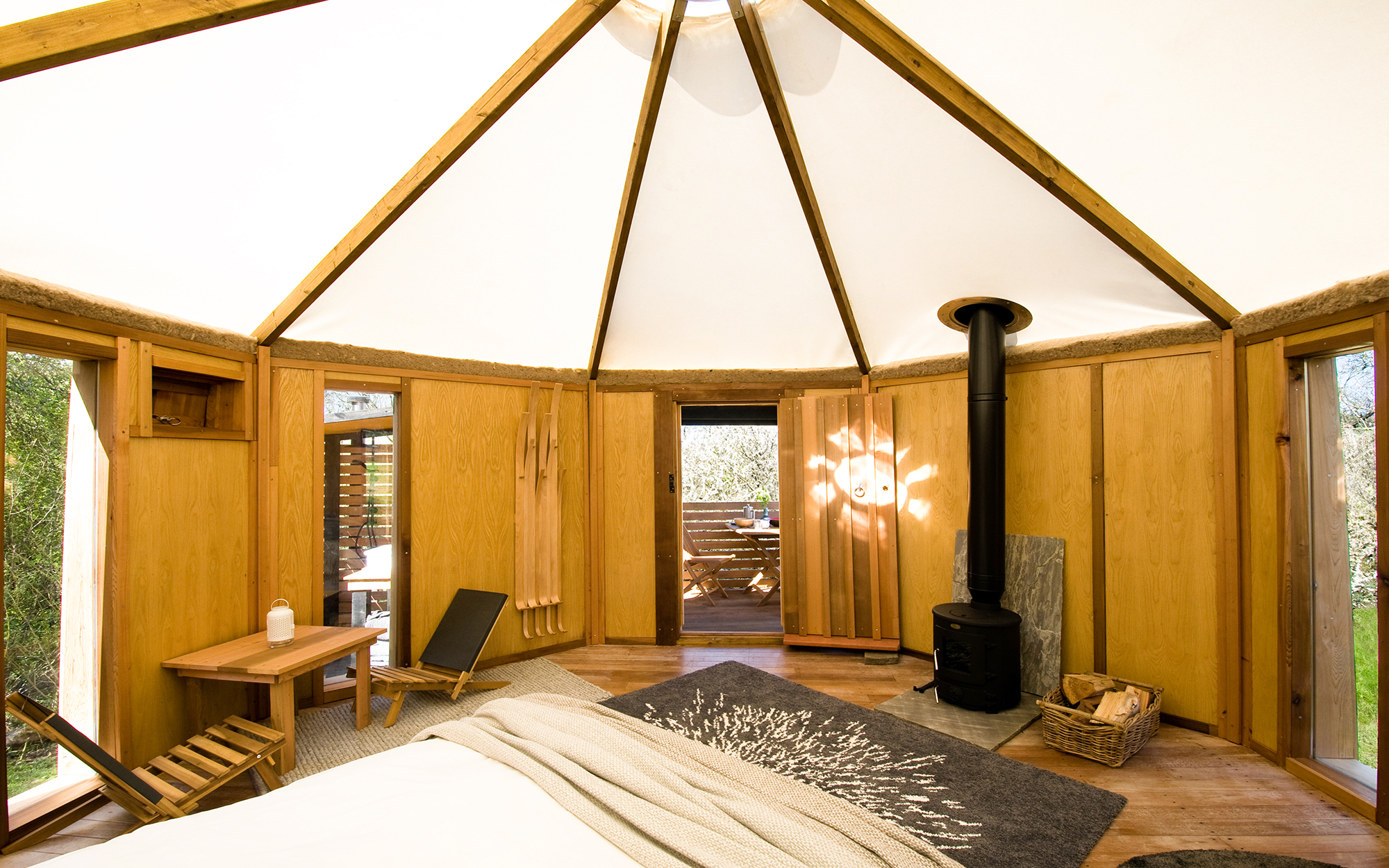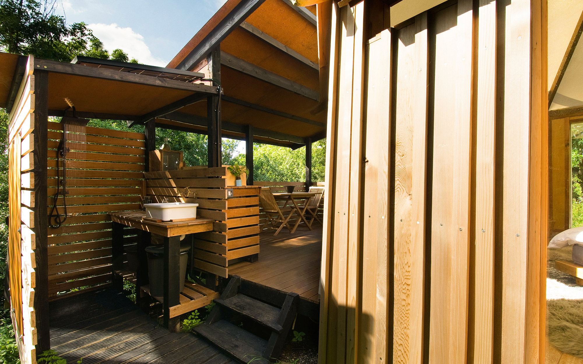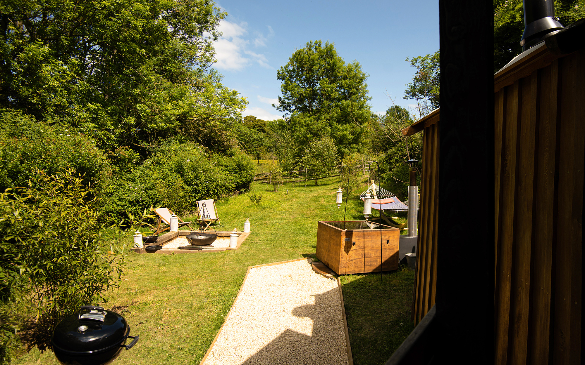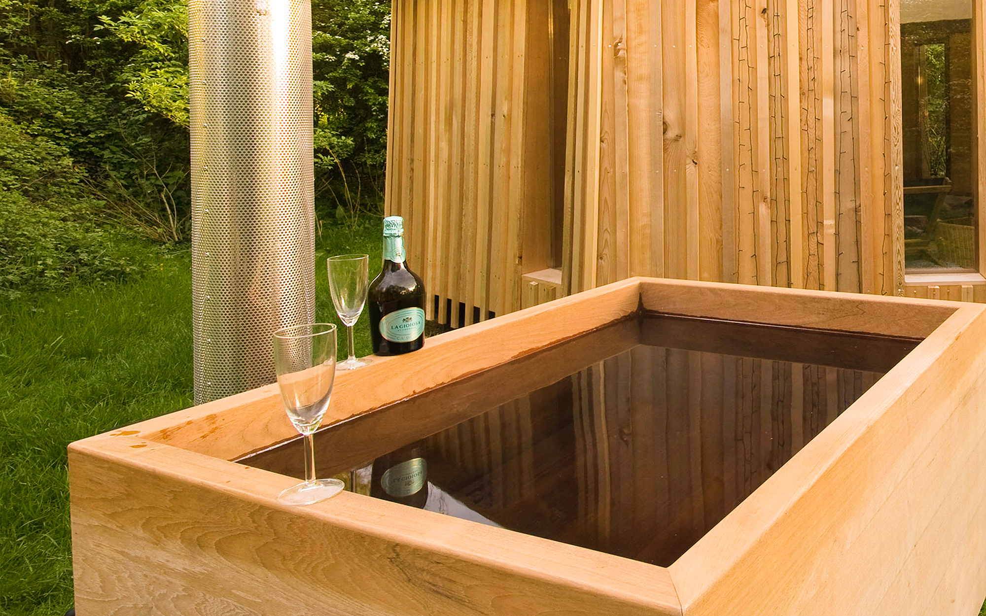 The ensuite toilet and hot shower are on the enclosed deck just outside the door, where you will also find the fully-equipped camp kitchen. Next to the cabin, set in the woodland glade, is the Ofuro soaking tub, an exquisite piece of traditional Japanese design given a contemporary tweak by some serious dudes in California. Unlike more conventional hot tubs, the Ofuro is square, crafted in teak and heated by its own wood-burning stove.